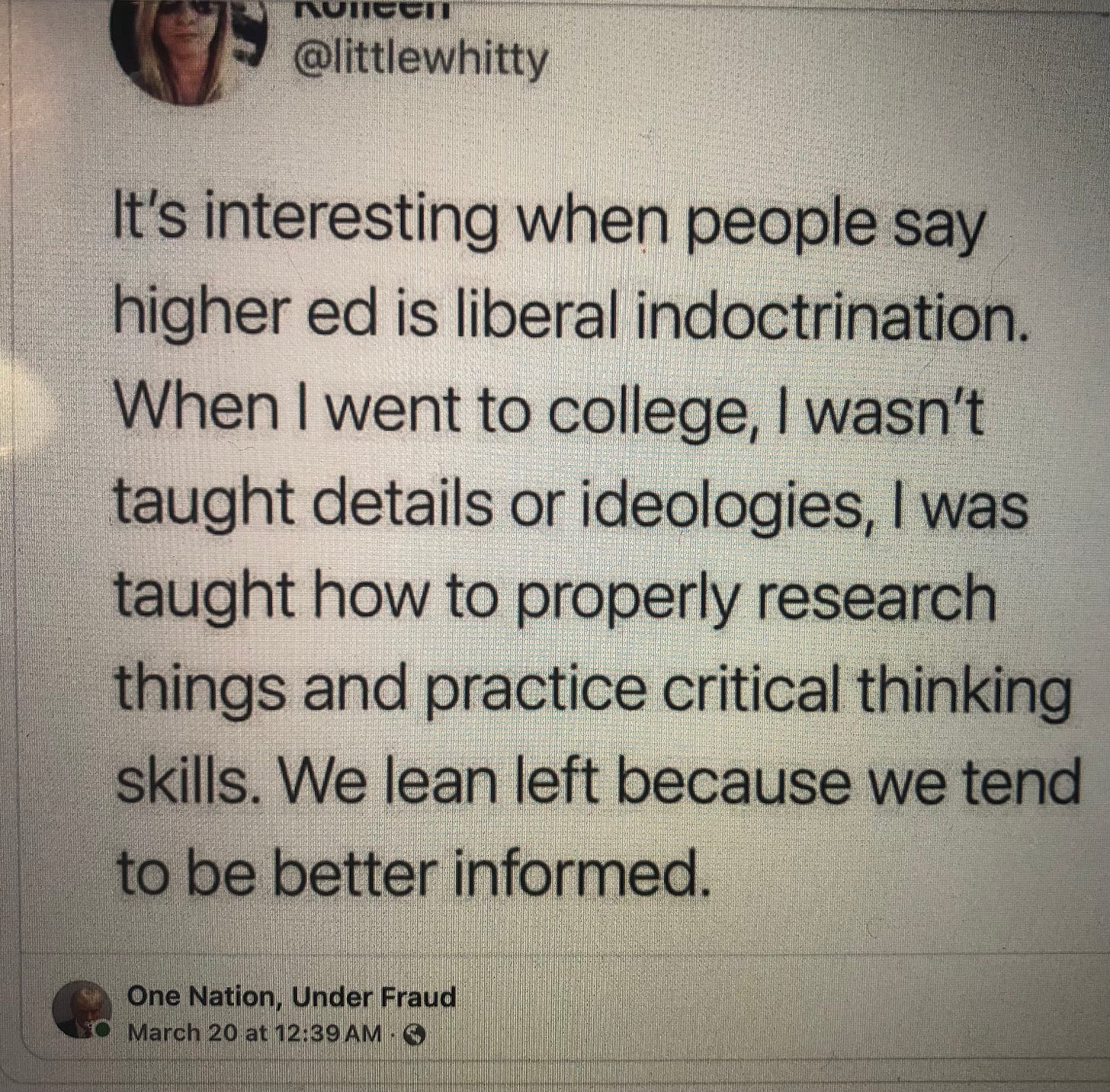 How can one be “better informed” if one “wasn’t taught the details?” How can one “properly research things and practice critical thinking skills” without the details? What does “properly research things” mean to *littlewhitty? How could *littlewhitty have completed four or more years of college firm in the belief that ideologies were not taught? Ideologies such as feminism, identity politics, and environmentalism are taught in most colleges. These ideologies are inherent in leaning left.
